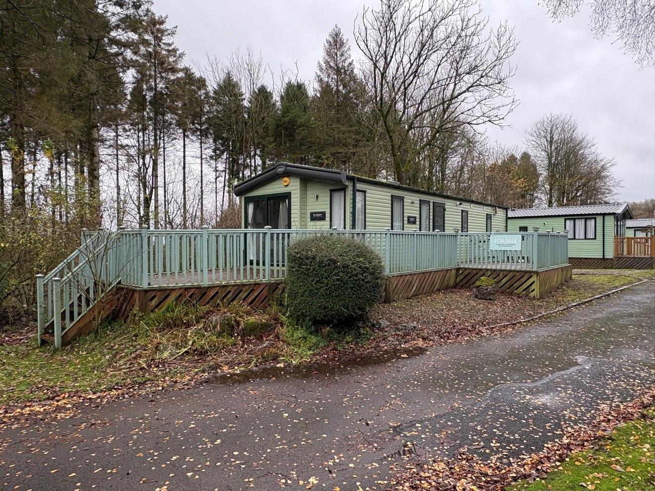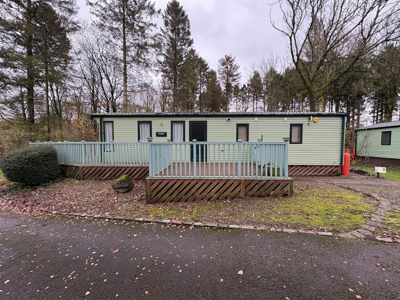 Outside, the ABI Roxbury truly shines with its large wraparound decking, offering an inviting space to enjoy the fresh air and views of the surrounding park. Steps lead down to a gravel parking area, providing easy access and convenience.