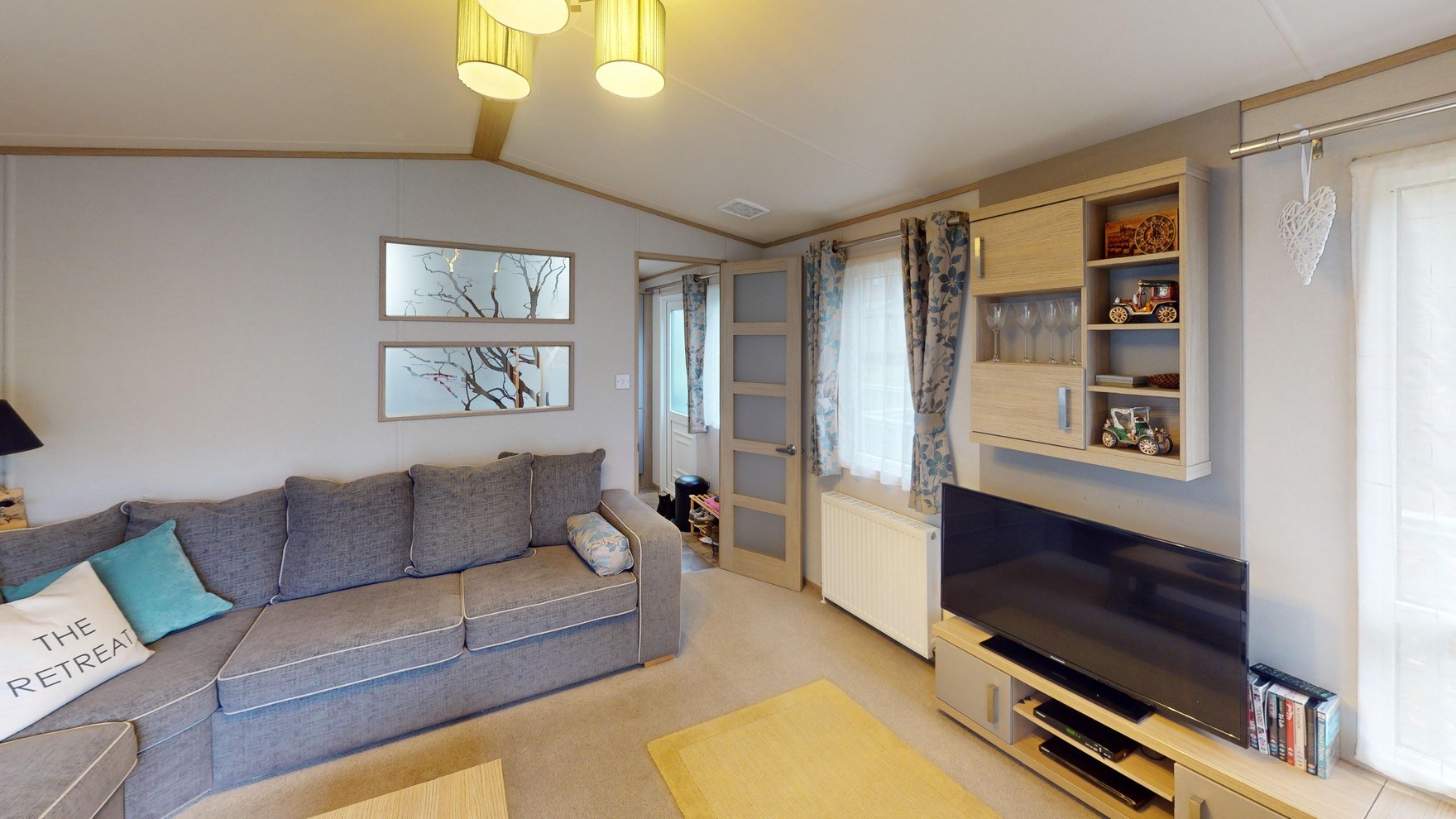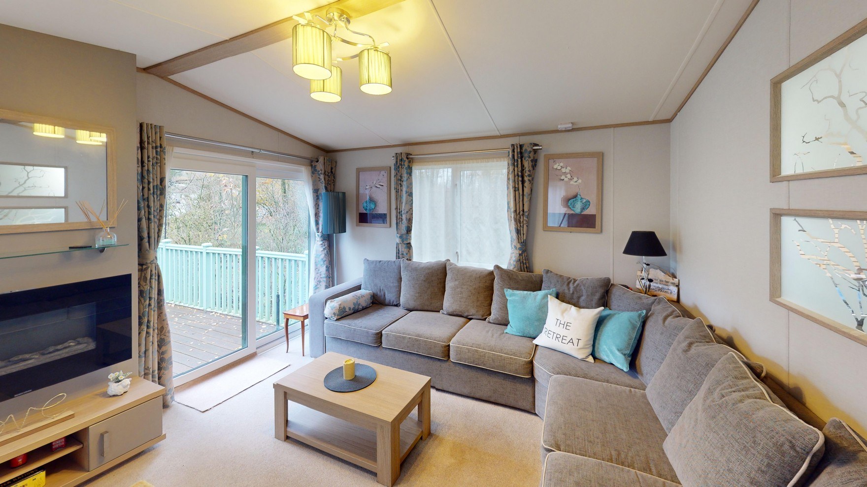 The living room is a warm and inviting space, featuring a large L-shaped sofa, plenty of storage, and an electric fireplace for cosy evenings in. Large windows flood the room with natural light, while sliding doors open directly onto the spacious decking, creating a seamless connection between indoor comfort and outdoor relaxation. A partition wall subtly divides the kitchen and living room, providing two distinct yet connected areas for flexible living.