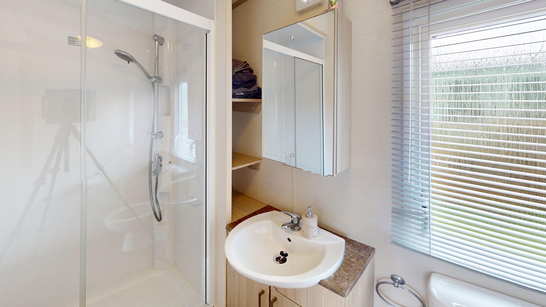 The main bathroom is modern and well-appointed, featuring a fully enclosed shower, wash basin, mirror, and dual flush WC. Clean lines and contemporary fittings create a fresh, functional space.