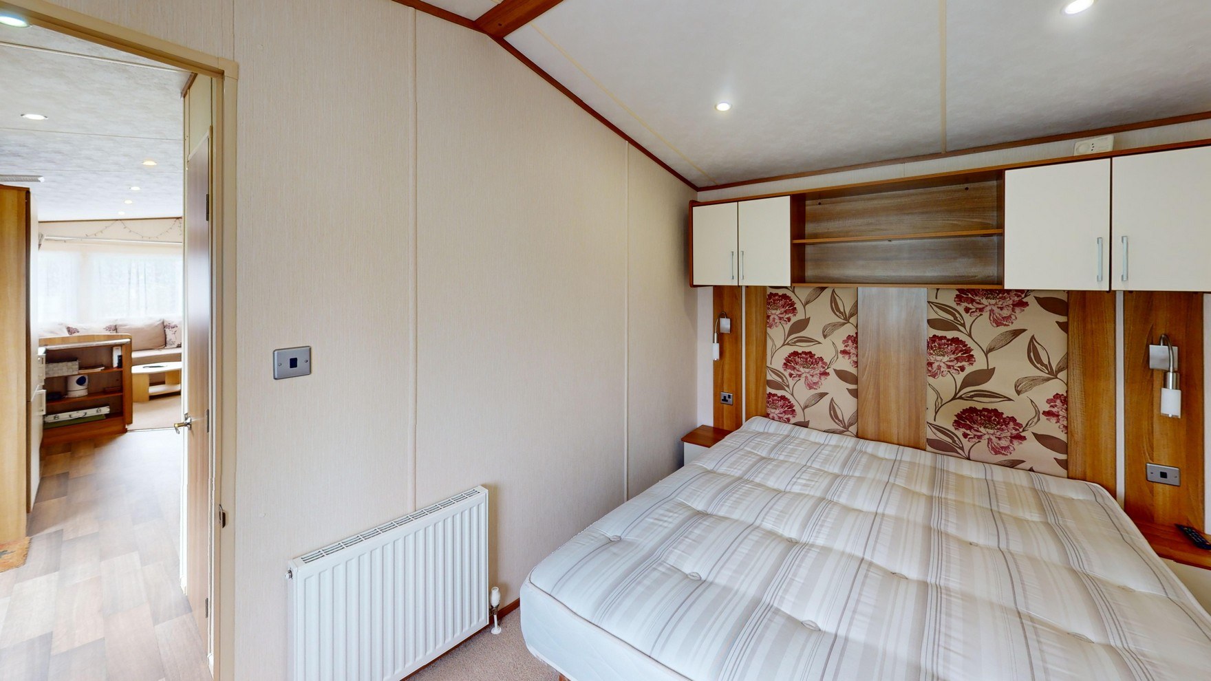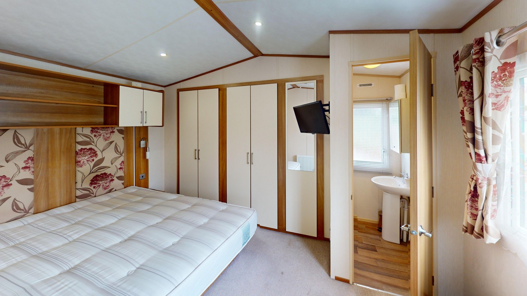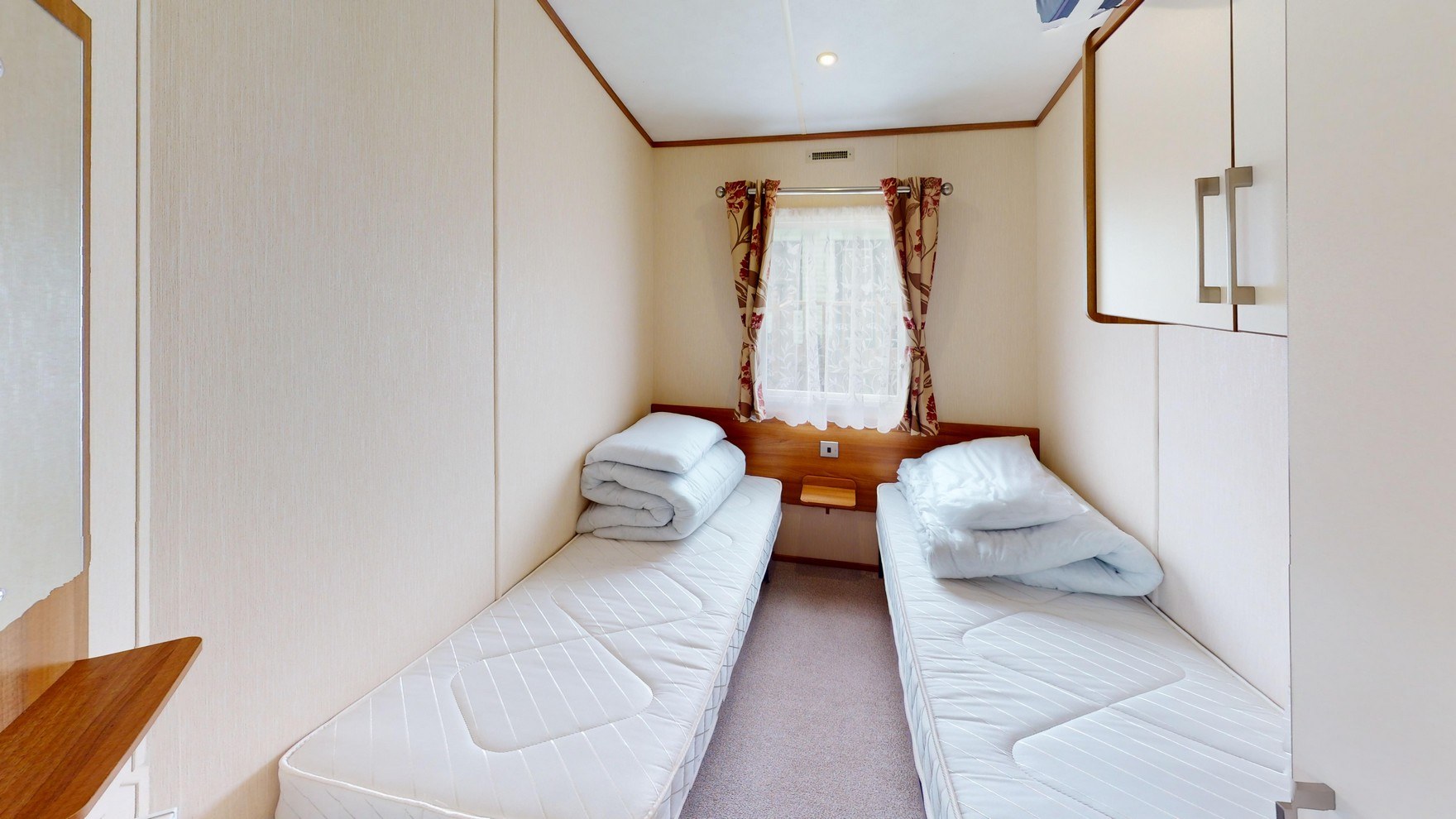The twin bedroom is ideal for family or guests, offering two comfortable single beds with headboards and mattresses. With its own wardrobe, overhead storage, bedside table, and mirror, the room is both practical and уютный, finished with soft fabric curtains for a homely touch.