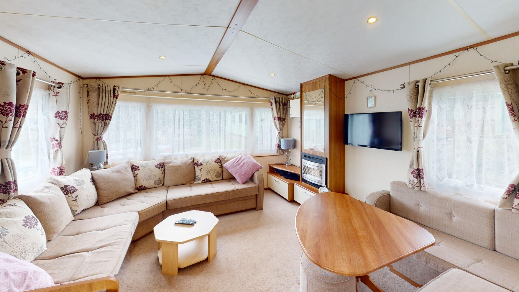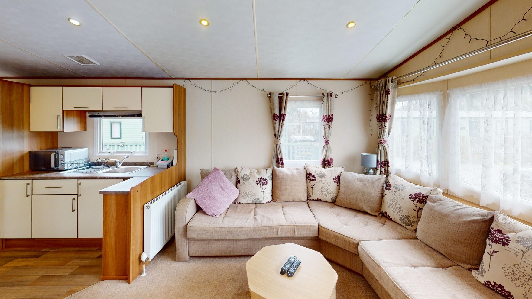 The spacious living area is the heart of the home, offering a warm and inviting place to unwind. A comfortable L-shaped sofa provides ample seating and easily converts into a sofa bed, making it ideal for hosting additional guests. A large television creates the perfect setting for cosy evenings, while a feature mirror and expansive windows enhance the sense of space and light, bringing the outdoors in.