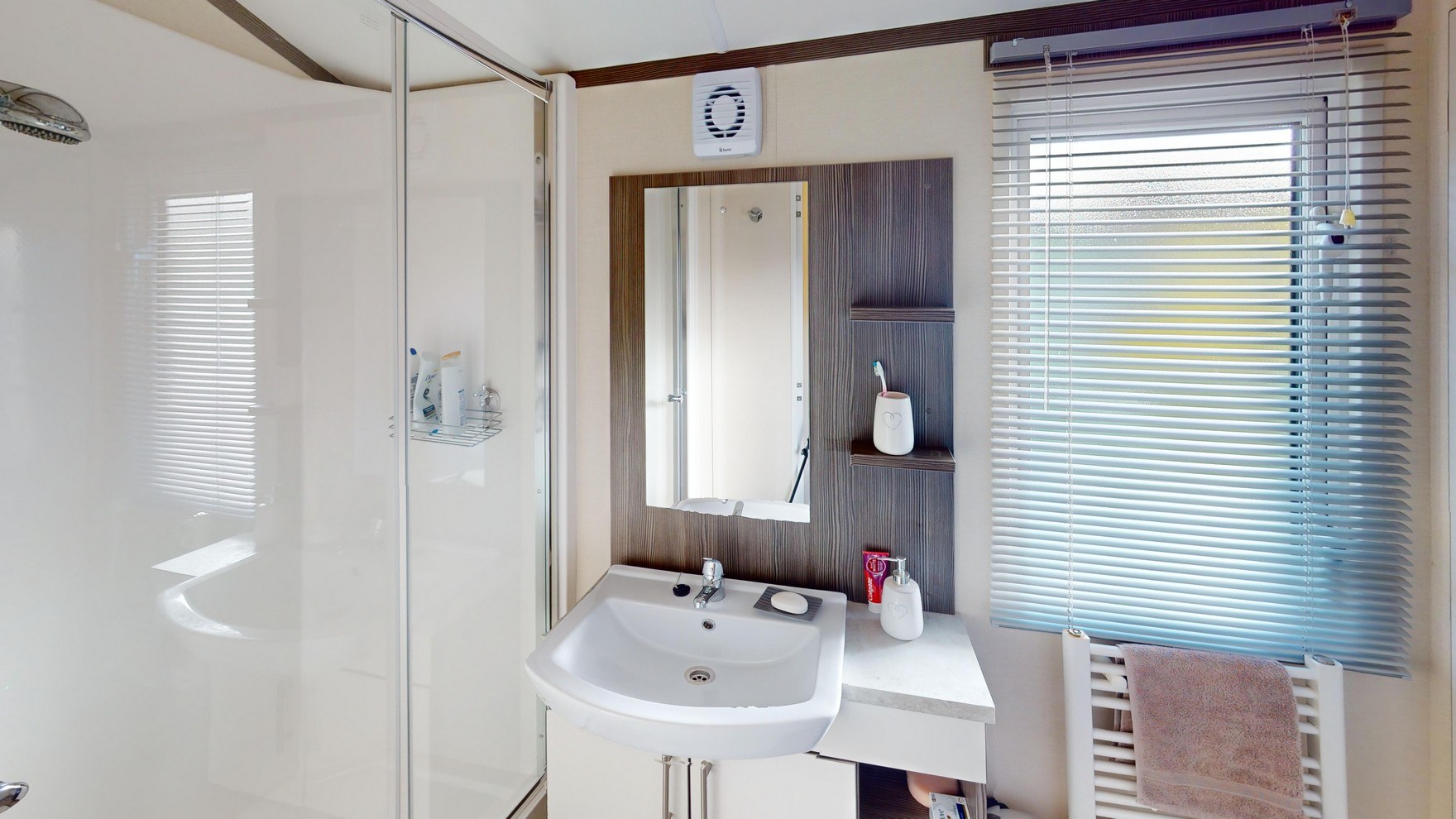The main bathroom is both modern and practical, offering an enclosed shower, dual flush WC, wash basin, and mirror — ideal for freshening up after a day spent exploring or relaxing outdoors.