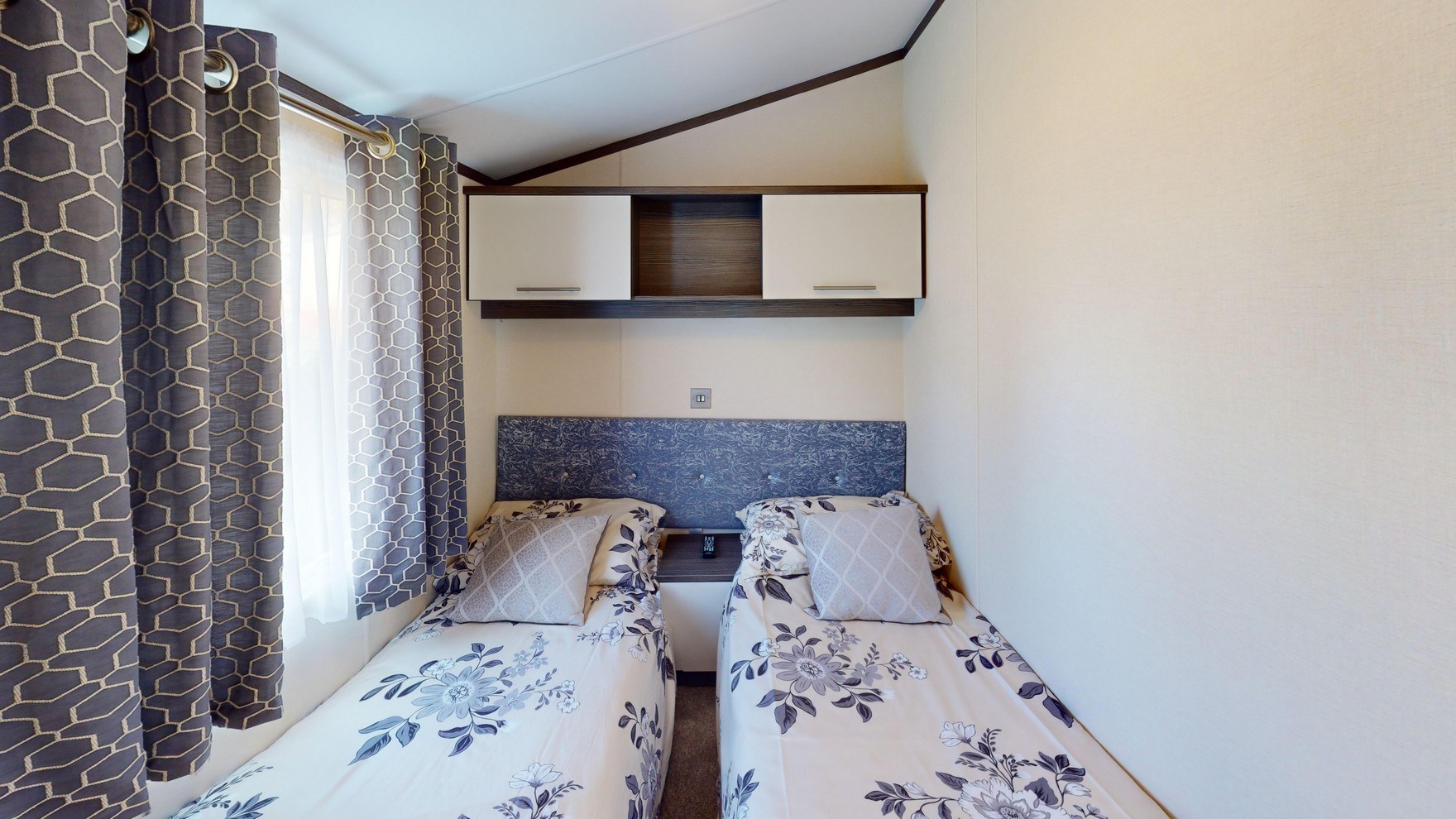 The twin bedroom is thoughtfully designed for comfort, featuring two single beds with matching headboards, a bedside table, wardrobe, overhead storage, and a wall mirror. Soft fabrics and gentle lighting make it a cosy space for guests or children to enjoy.