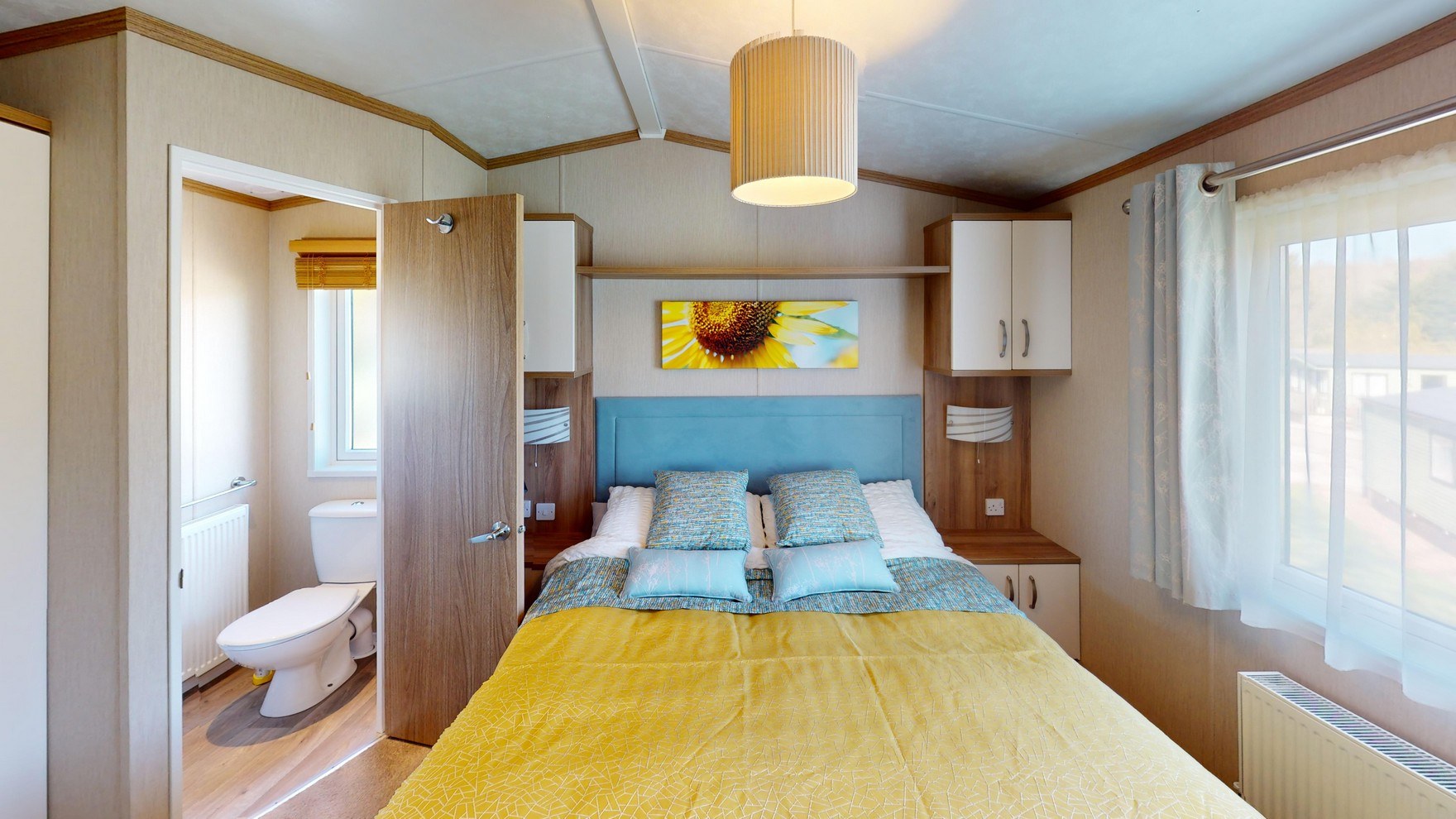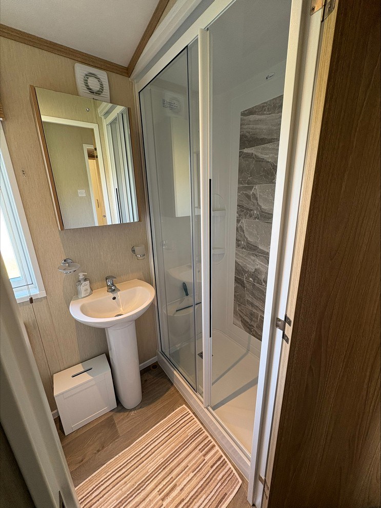 The holiday home comfortably sleeps up to six people, thanks to a double sofa bed in the lounge. The main bedroom is a relaxing retreat, featuring a double bed with a convenient lift-up storage base for additional space, bedside cupboards, a combination of double and single wardrobes, and a dressing table with mirror. It also benefits from a private ensuite with a toilet and basin. The second bedroom offers flexibility, currently arranged with a double bed but with space to accommodate two small single beds if preferred, along with overhead storage and a small double wardrobe.