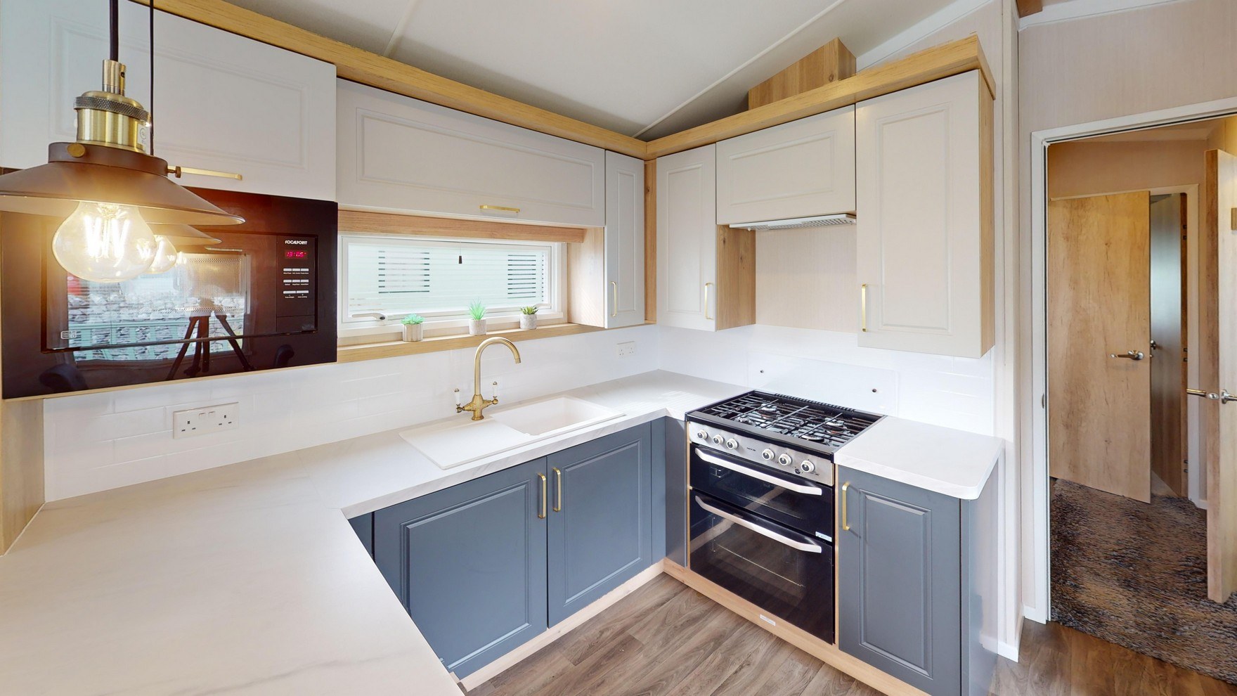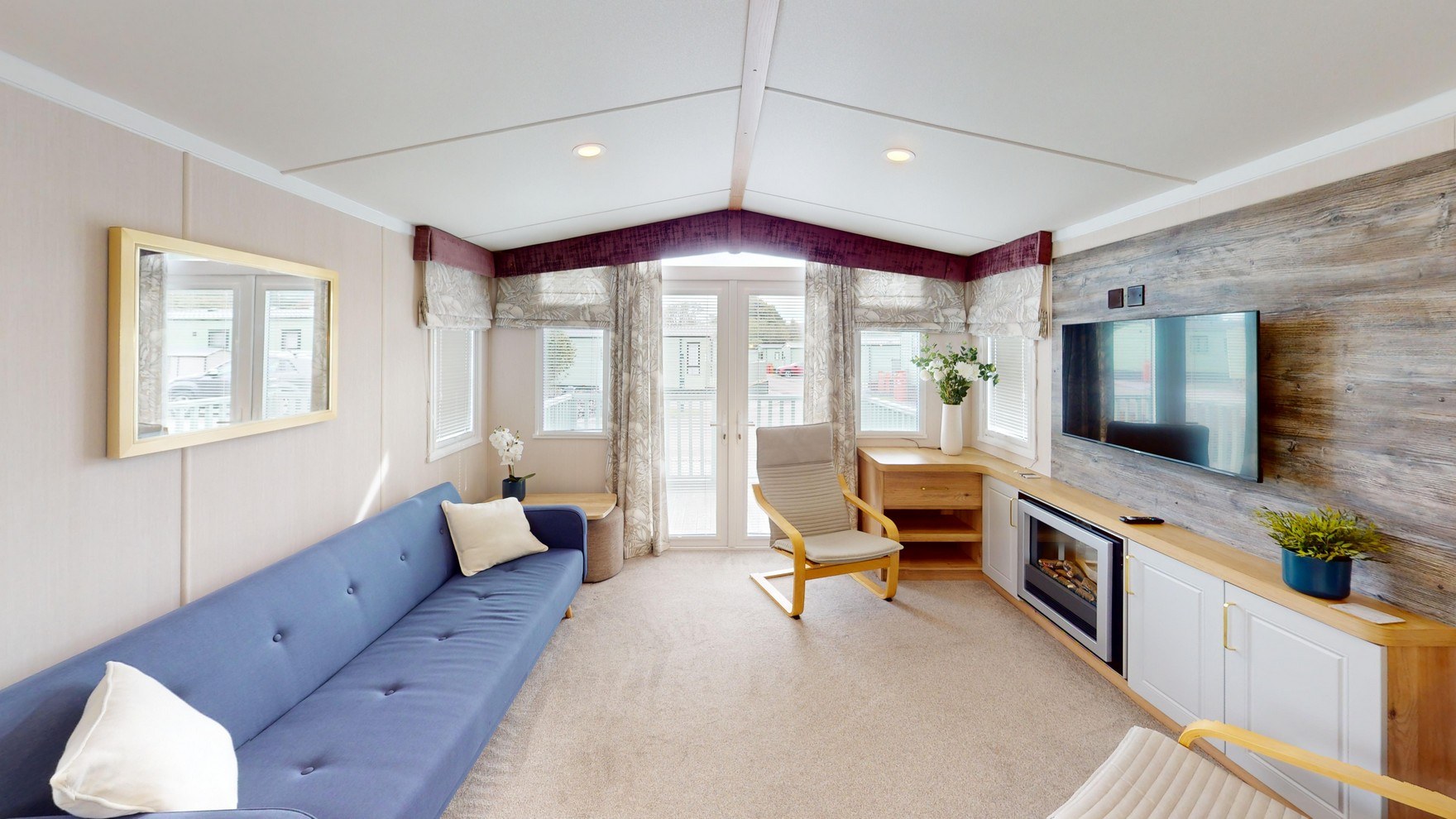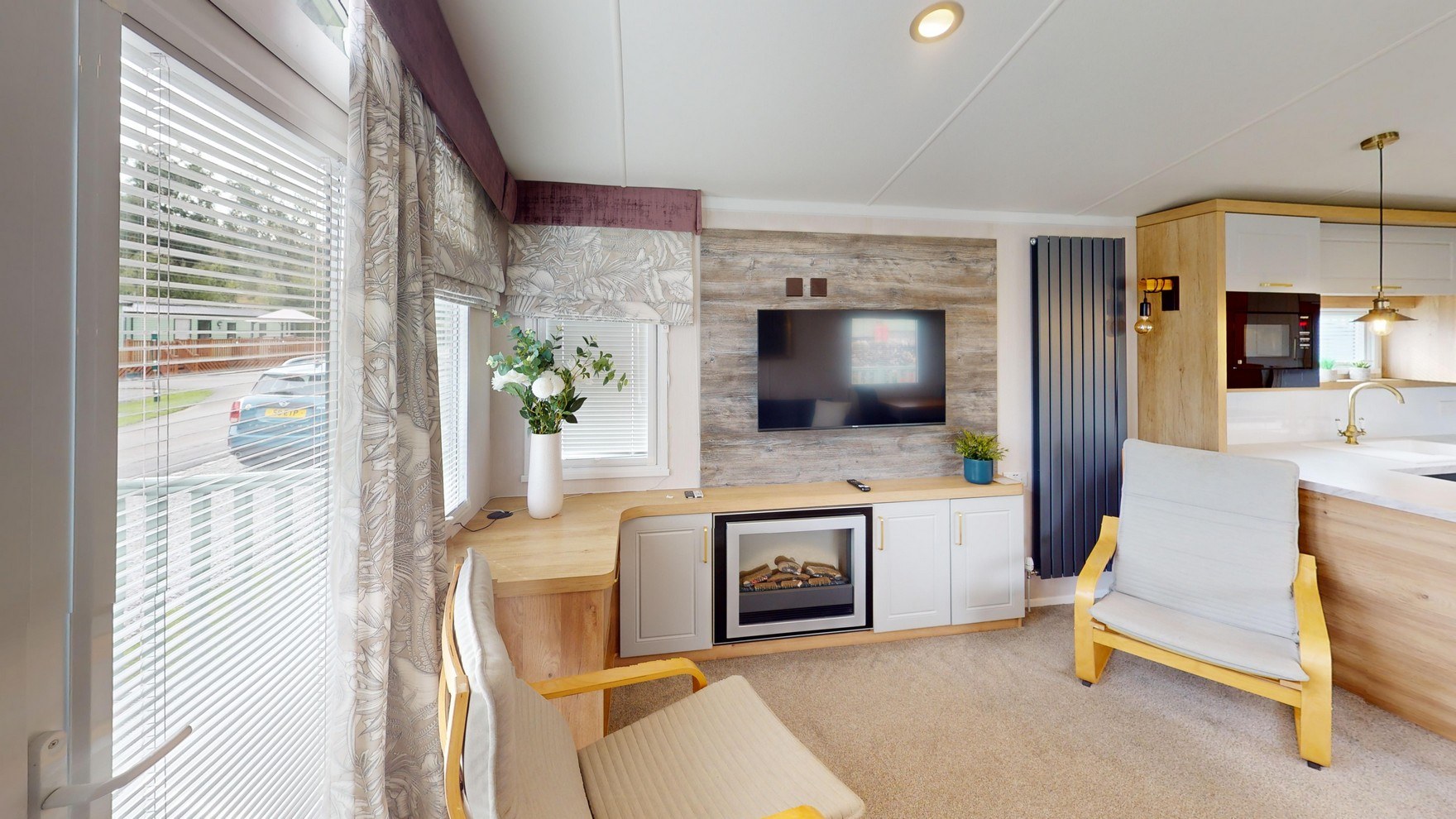 Entering the holiday home, you walk straight into a bright and welcoming open-plan living space. To your left, the lounge invites you to relax with its comfortable sofa, coffee table, and feature electric fire. Large windows surround the room, flooding the space with natural light and offering views of the park, while built-in storage ensures everything has its place.