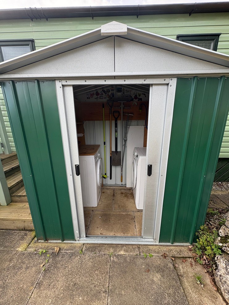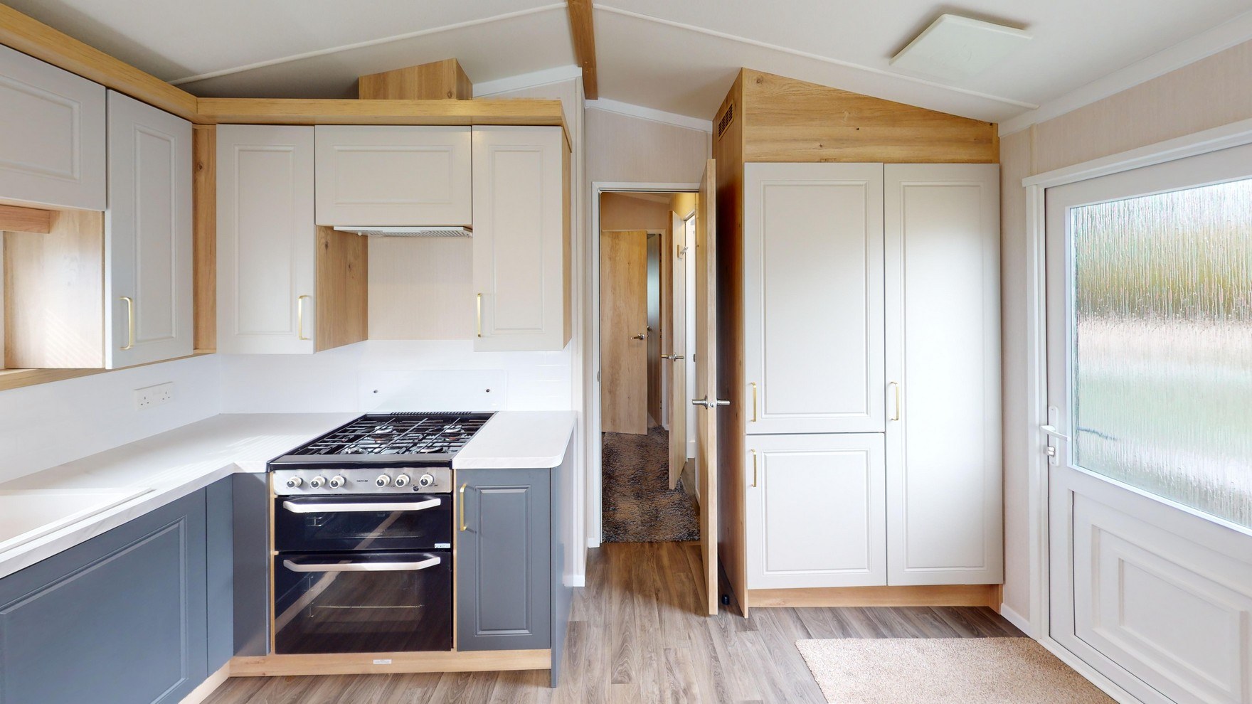 As you step onto Plot 93 at Long Ashes Park, you’re greeted by a generous decking area – the perfect spot for outdoor furniture where you can enjoy peaceful mornings with a coffee or summer evenings with friends. Steps lead you down to a private garden, complete with a shed housing a washing machine and tumble drier, alongside a gravel parking space for convenience.