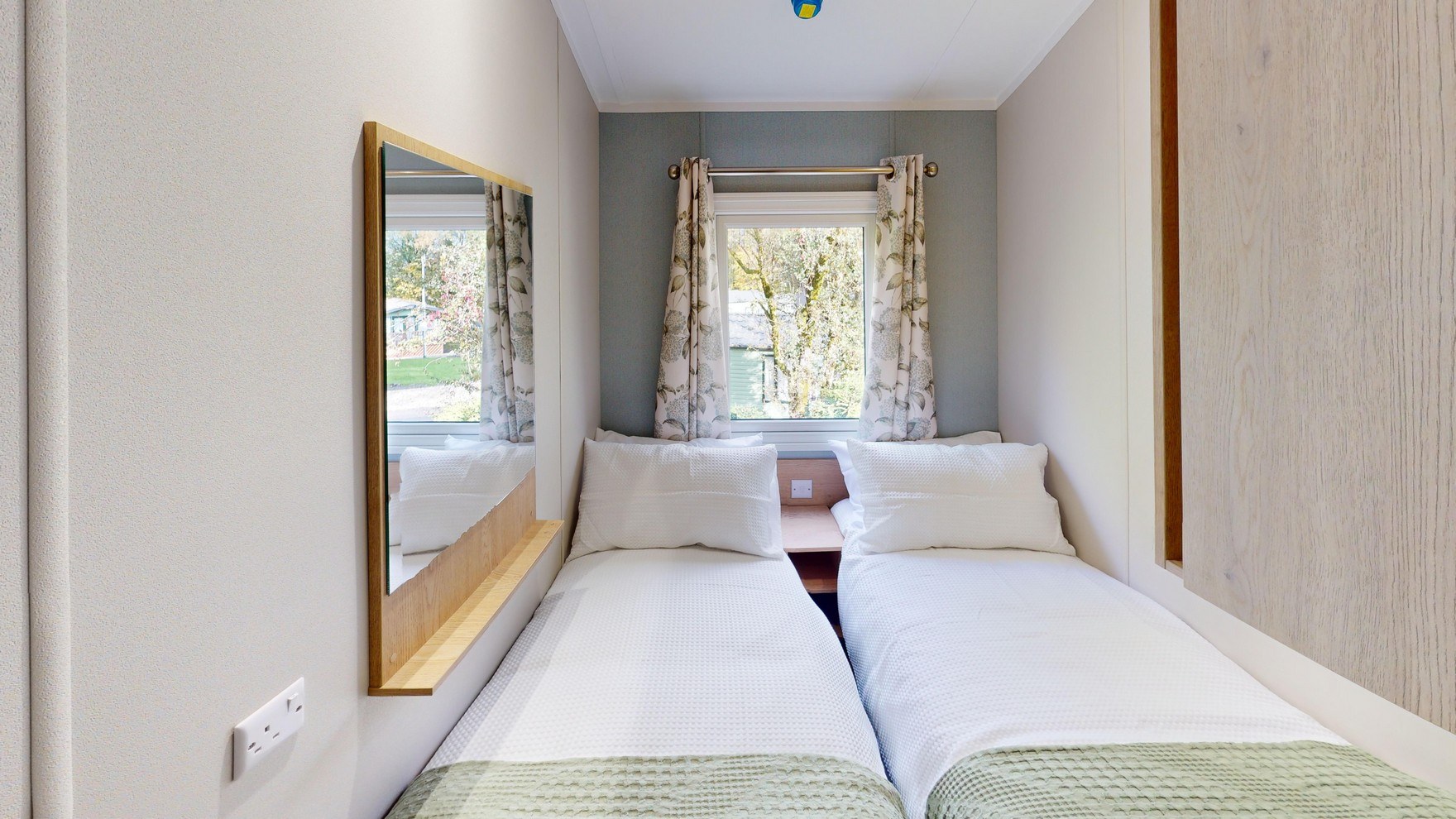 The master bedroom provides a peaceful haven with a comfortable double bed, bedside table, wardrobe, mirror, and fabric curtains that add a soft, homely touch. The twin bedroom is perfect for guests or children, complete with two single beds, a bedside table, wardrobe, and mirror, maintaining the same thoughtful attention to comfort and style.