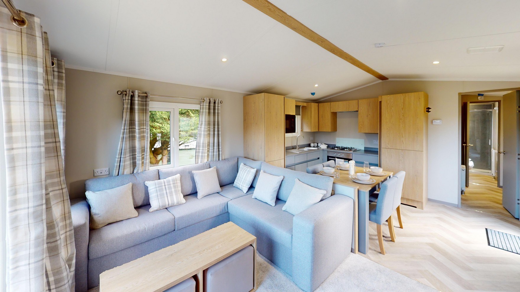 Step inside to discover a bright and contemporary open-plan living area, thoughtfully designed to make the most of the natural light streaming through the large windows. The spacious lounge features a comfortable L-shaped corner sofa, creating the perfect spot to sit back and enjoy the views or gather with family and friends. There’s plenty of storage throughout, ensuring everything has its place and the home always feels calm and clutter-free.